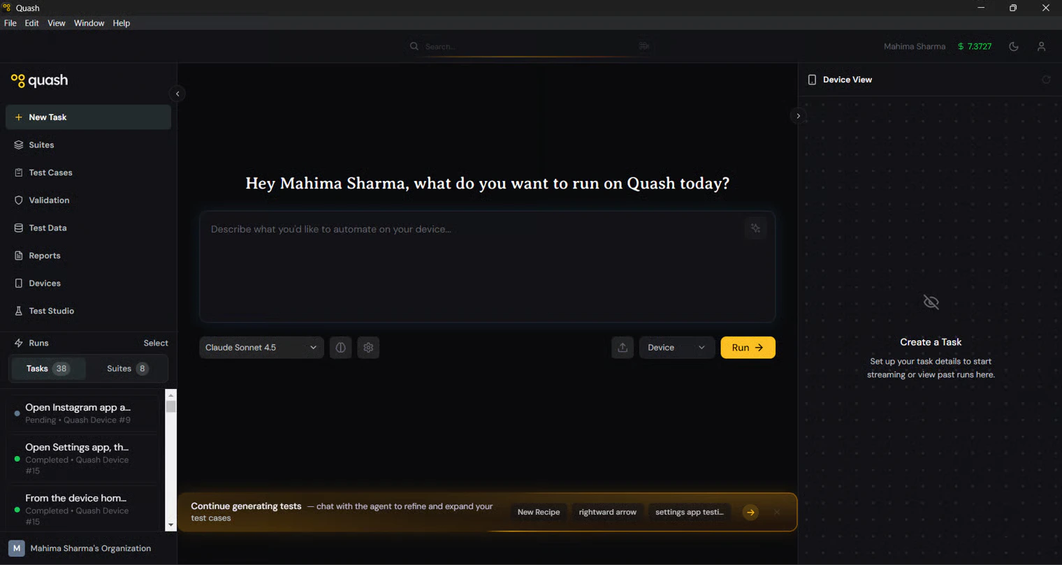 When you open Quash, you see three areas: Left navigation panel — the vertical sidebar on the left. This is how you move between every major section of Quash. It stays visible at all times. Central workspace — the main area where you do your work. What appears here changes depending on which section you have open — a recipe conversation in Test Studio, a list of test cases in Test Cases, a report detail view in Reports. Right-side panels — slide-in panels that appear when you click controls on the right edge of the screen. In Test Studio, these include the TESTS panel (showing generated test cases) and the CONFIG panel (controlling how Recipe generates tests). In Reports, the Device View panel shows the screen recording. The profile button in the top-right corner opens your account settings, organisation details, device management, and integrations.What each section does